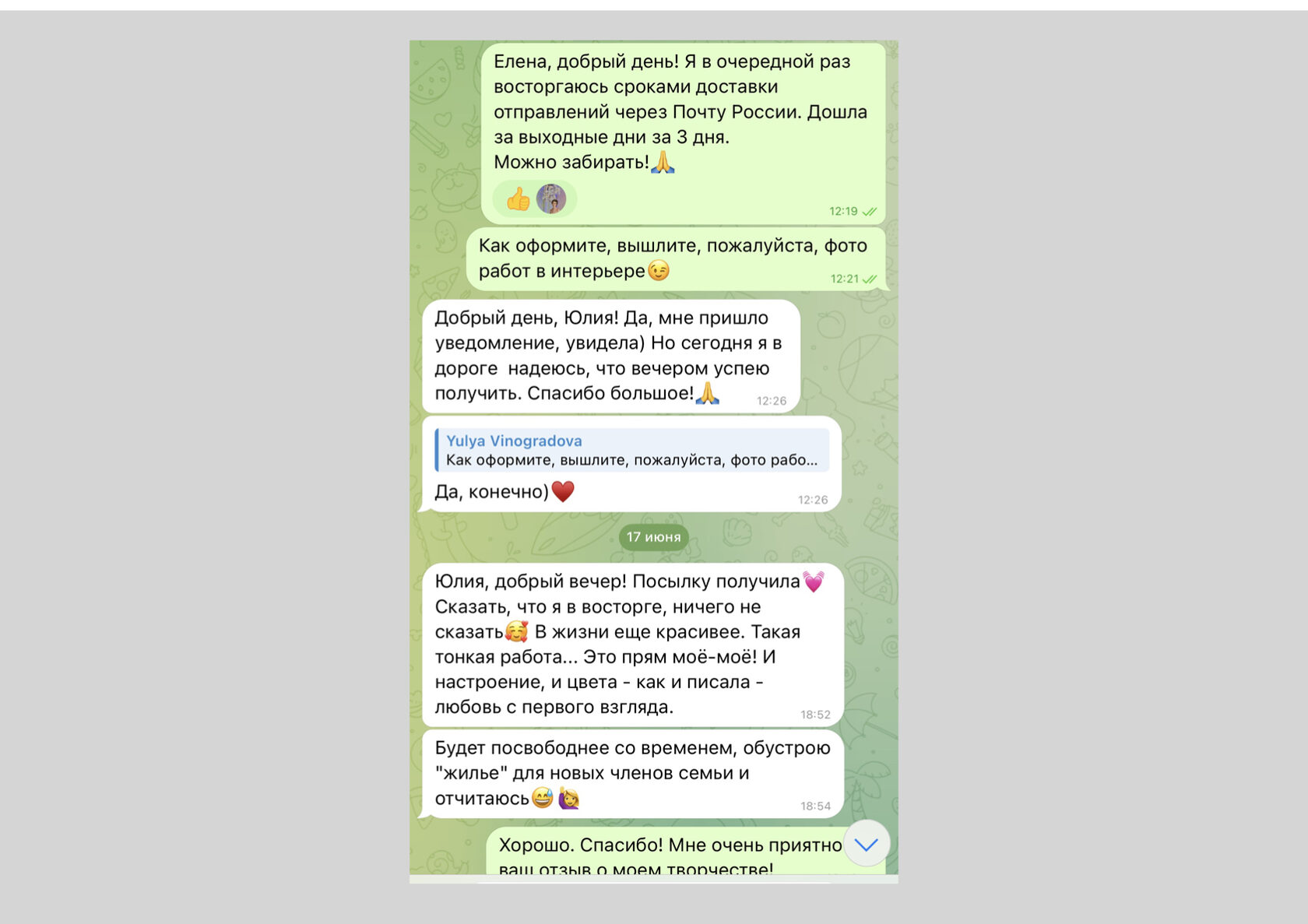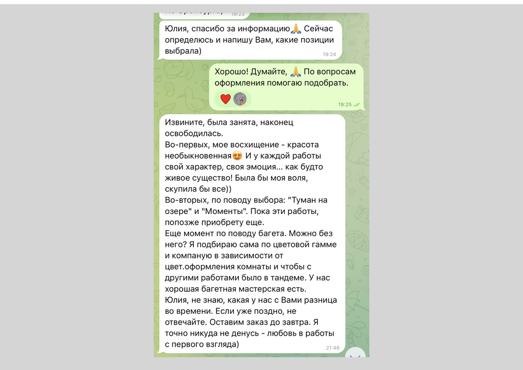 Я не передаю художественные работы "голыми". Поэтому подбираю "одежду" индивидуально для каждого произведения по цвету, стилю, материалу. При приобретении картины обговариваем предпочтения по стилю багета.